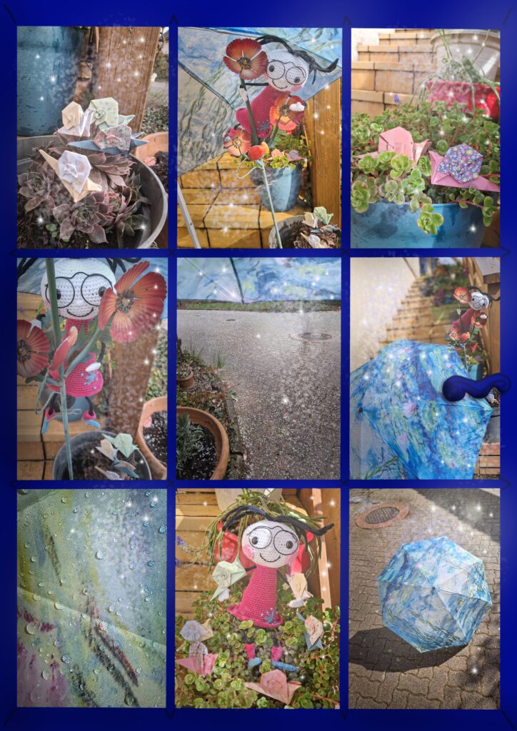 Nous voici dehors sous des nuages bien gris mais qui retiennent pour l’instant leurs larmes de crocodile. Nous installons nos petits amis de papier (merci beaucoup Maman et clin d’œil à l’association Origami Alsace !), nous sommes prêtes à dégainer l’appareil photo… et soudain le vent se lève, Mimi manque de tomber de son perchoir, les escargots se découvrent des ailes invisibles et s’envolent, le parapluie prend son indépendance et trace sa route !